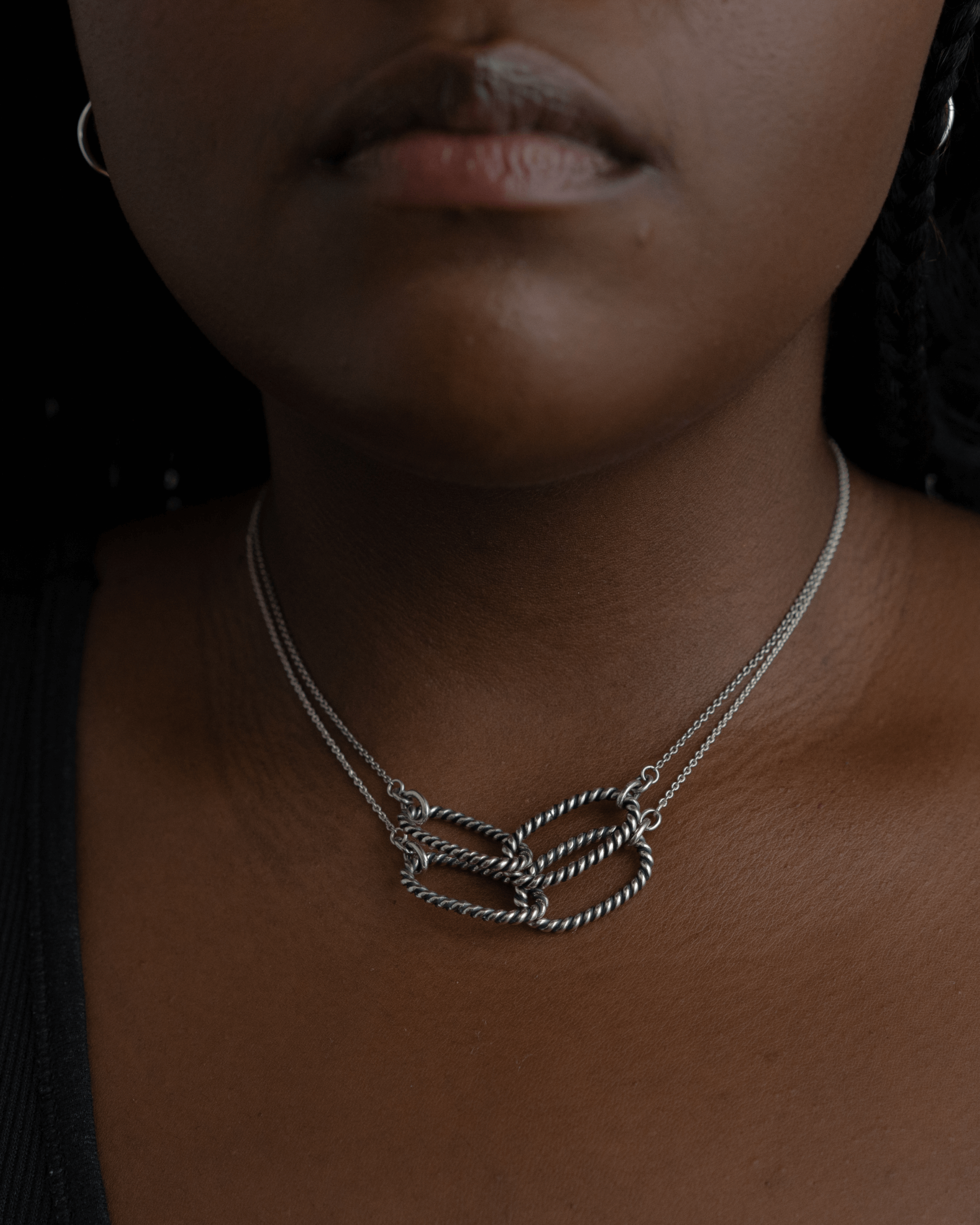 The Original Link Necklace can be worn alone as a bold staple piece for daily wear or stacked with multiple Links to create a sculptural effect. The grooves are intentionally darkened to emphasize depth and contrast within the silver twists.